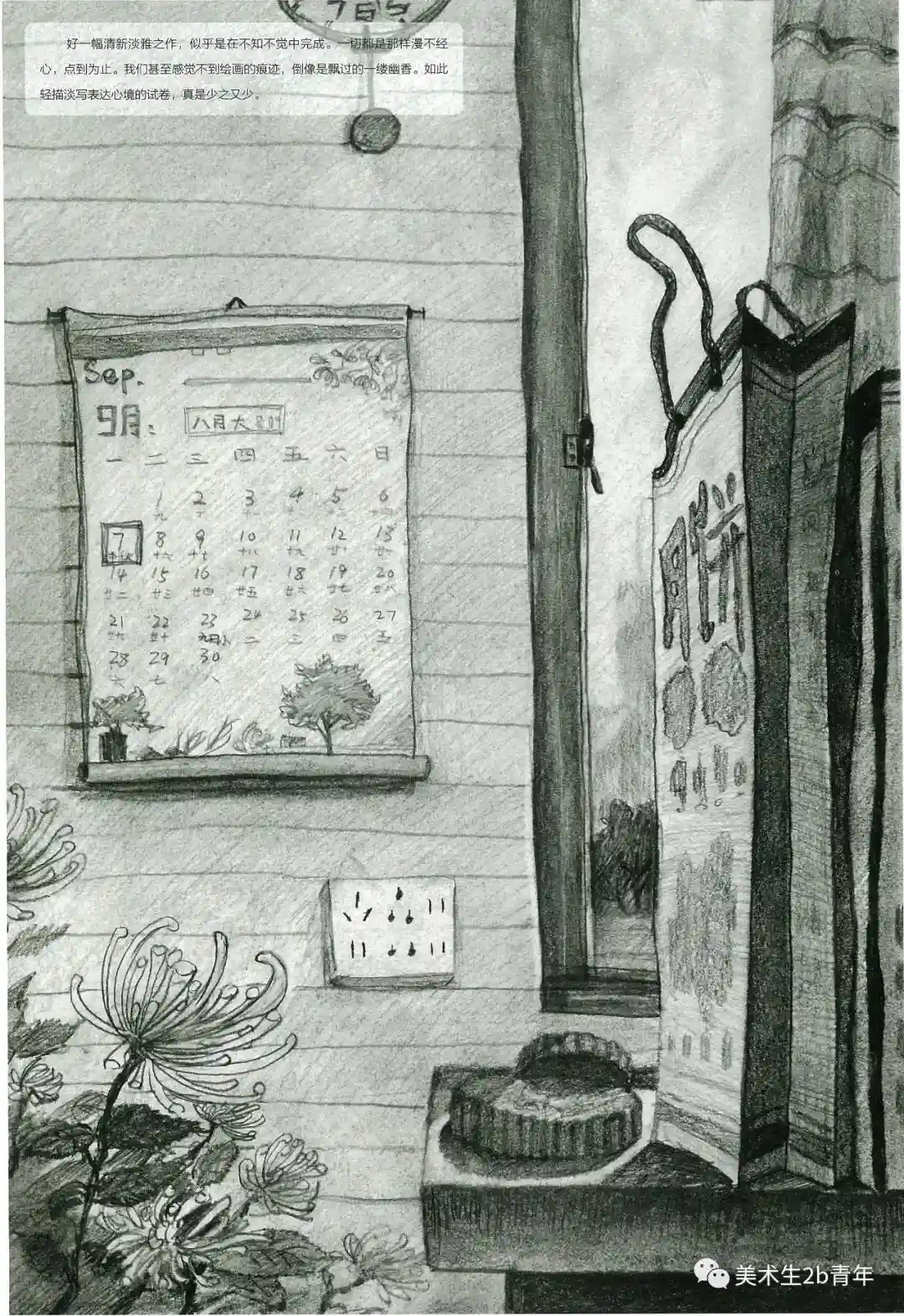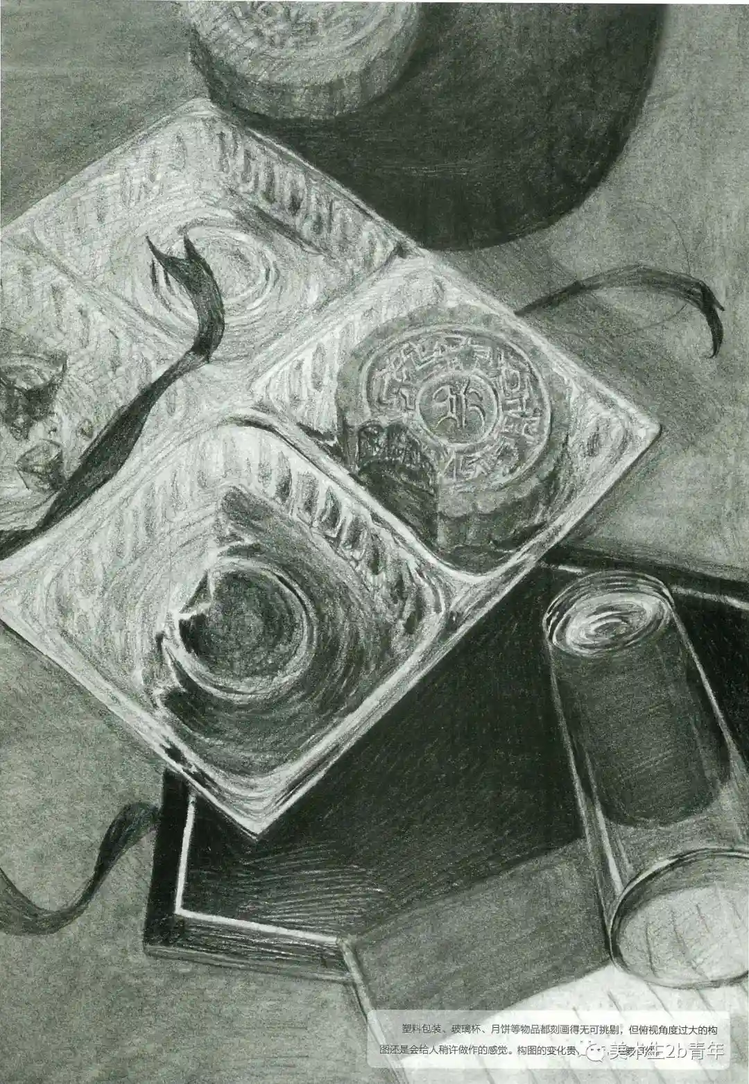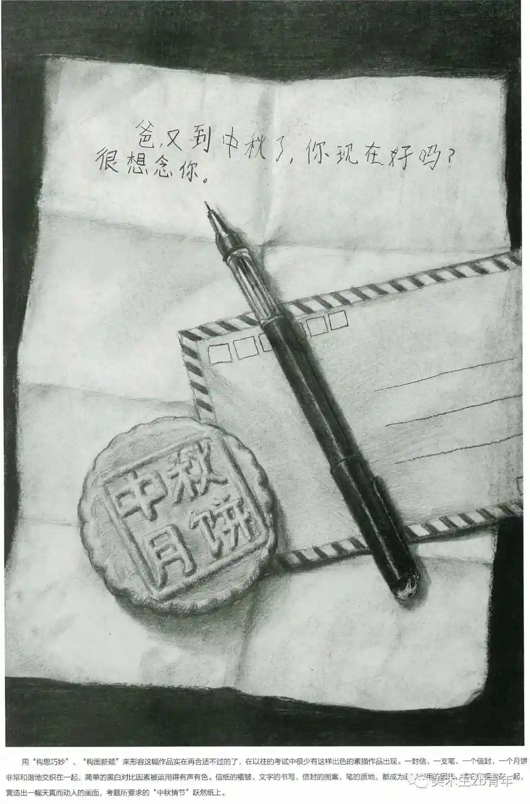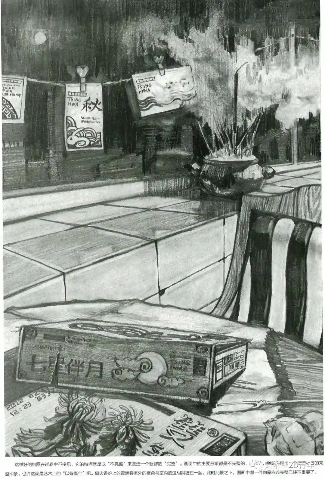 中国的美术考生扎实的基本功和个人的综合素养还是非常高的。下面以清华为例来看一下。某年的清华素描考题中秋节—根据题目默画不少于三件物品,注意氛围营造。