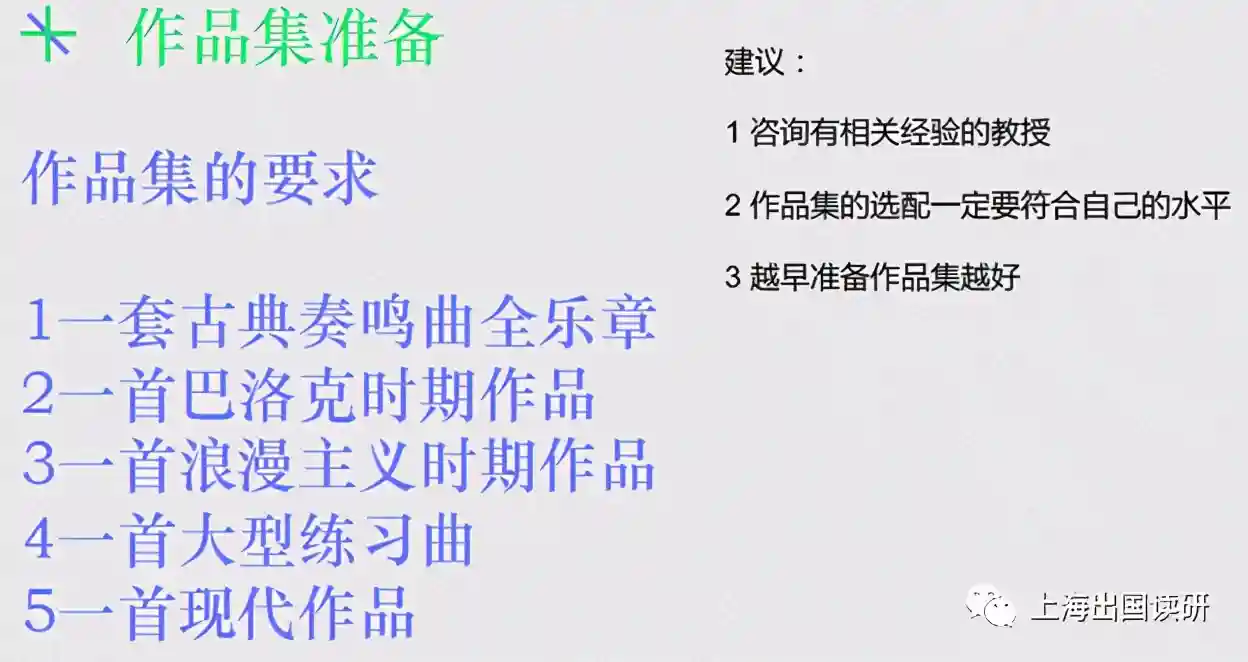 作品集的准备包括选曲和分配,是比较有讲究的,包括欧美老师的一些喜好方面。所以建议同学们还是去联系一些有经验或有比较好留学经历的教授,让他们根据你的水平给你安排布置一套适合准备考硕士的曲目。如果条件有限,没有办法找到有经验的教授,那就去找自己学校的老师,毕竟老师们对于曲库的广度和深度认知肯定比我们更加了解。整体来说作品集的选曲一般会比你个人的基础水平要拔高一些,切记不要自己盲目选择,还是要多咨询老师。